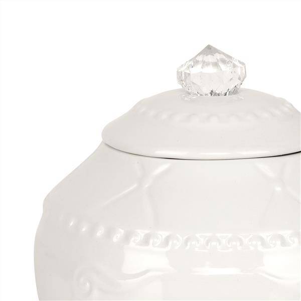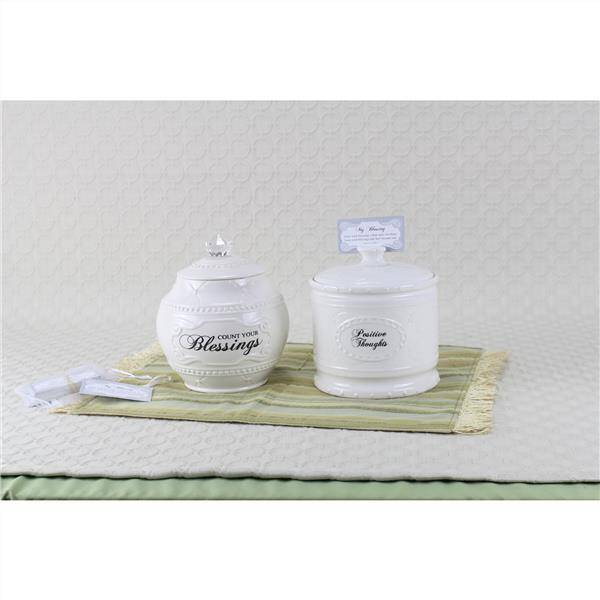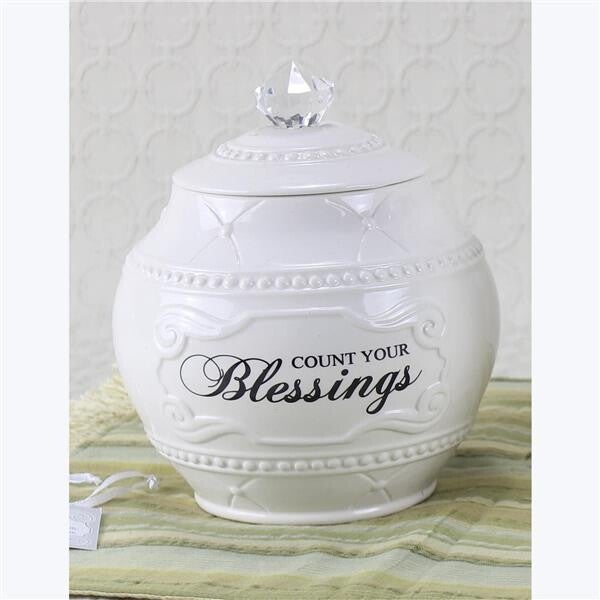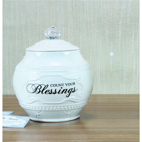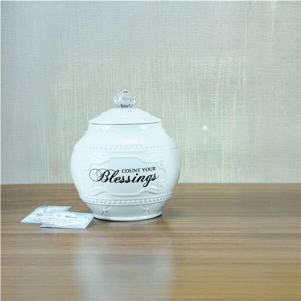 Celebrate gratitude and positivity with this elegant blessing jar. Crafted from ceramic with a glossy white finish, it features an ornate design and a crystal-like lid knob. The phrase Count Your Blessings is beautifully displayed, making it an inspiring centerpiece for any space.